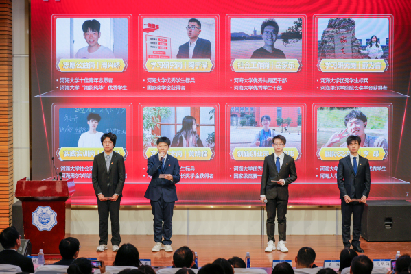 优秀学生代表分享交流成长体会。国家奖学金获得者喻涵,张闻天班提名班级2022级土木2班代表,“挑战杯”获奖代表林楠栖,研究生支教团代表周兴峤分别讲述成长历程、科创经验、班级建设与西部支教的责任担当。